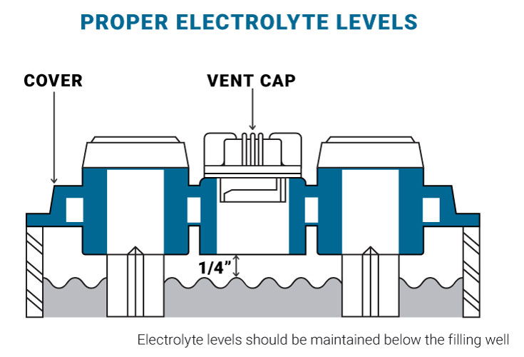 Ideally, a watering schedule should be adopted and strictly followed. As a best practice, water should be added to all of the batteries assigned to each charging area on a regular time schedule. The electrolyte levels should also be spot checked periodically to determine if the proper levels are being maintained. Determining a reasonable and proper battery watering time schedule is dependent on how widely the following three factors vary: