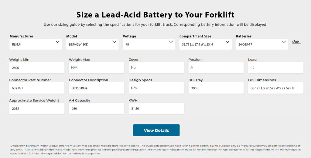 If the battery selected meets your application’s requirements, proceed to the battery detail page by clicking the View Details button. Here, you can view a further description of our lead-acid battery, view in-depth specifications, and further customize it to your application by including fast charge, opportunity charge, and high gravity options.