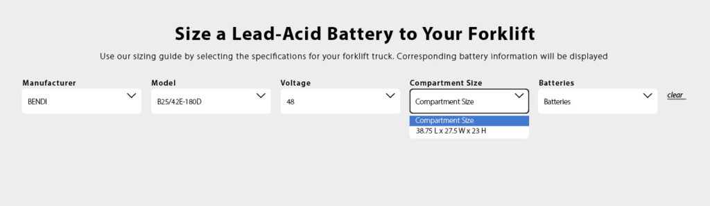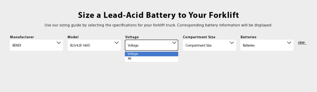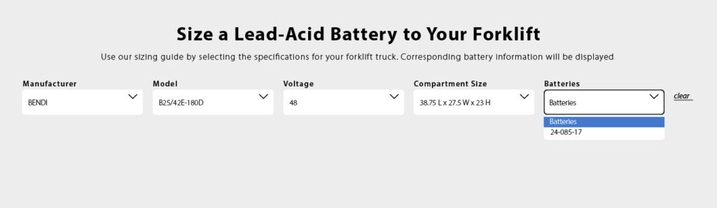 If the battery selected does not meet your application’s requirements or if you would like to check on another truck’s corresponding battery, simply rerun the configurator from any point in steps 1-4 or click clear to start over.