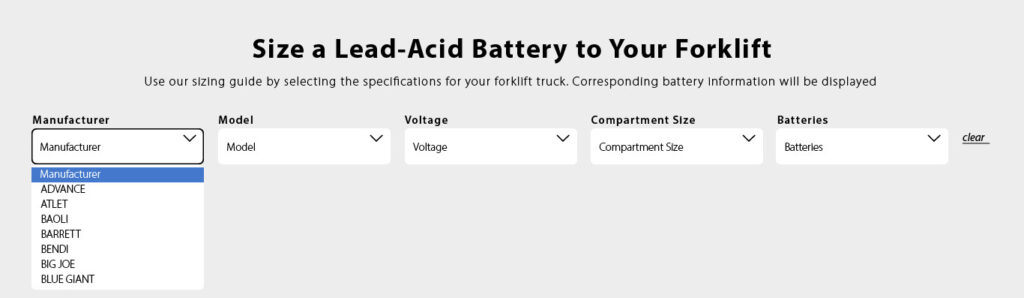 Follow the steps and guidelines below for using our configurator to specify an appropriate lead-acid forklift battery based on your truck application: